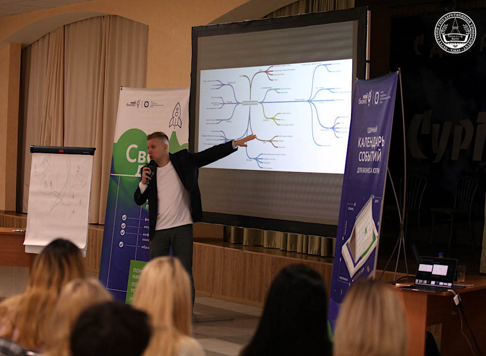 Послушать спикера – Михаила Галейченко – пришли не только преподаватели, студенты вуза и члены клуба центра молодежного предпринимательства «Дельфины бизнеса», но и сургутские предприниматели, а также лица, желающие открыть свое дело. В самом начале встречи успешный бизнесмен обратился к студентам СурГУ. Спикер-практик поблагодарил студенческую аудиторию за проявленный интерес к тренингу и призвал ребят активно включаться в работу.
