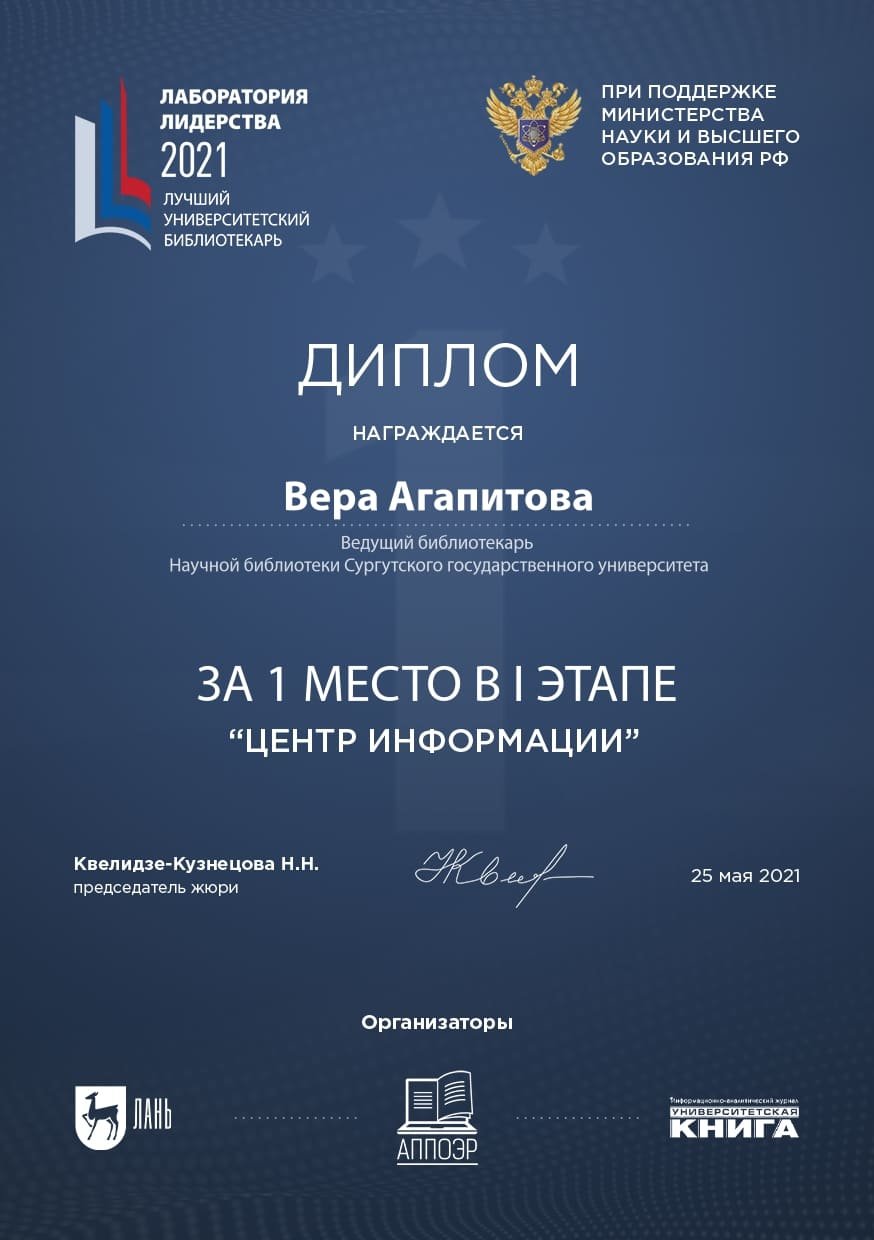 Ведущий библиотекарь Научной библиотеки СурГУ Вера Агапитова стала победителем I этапа Всероссийского конкурса «Лаборатория лидерства – 2021: лучший университетский библиотекарь».