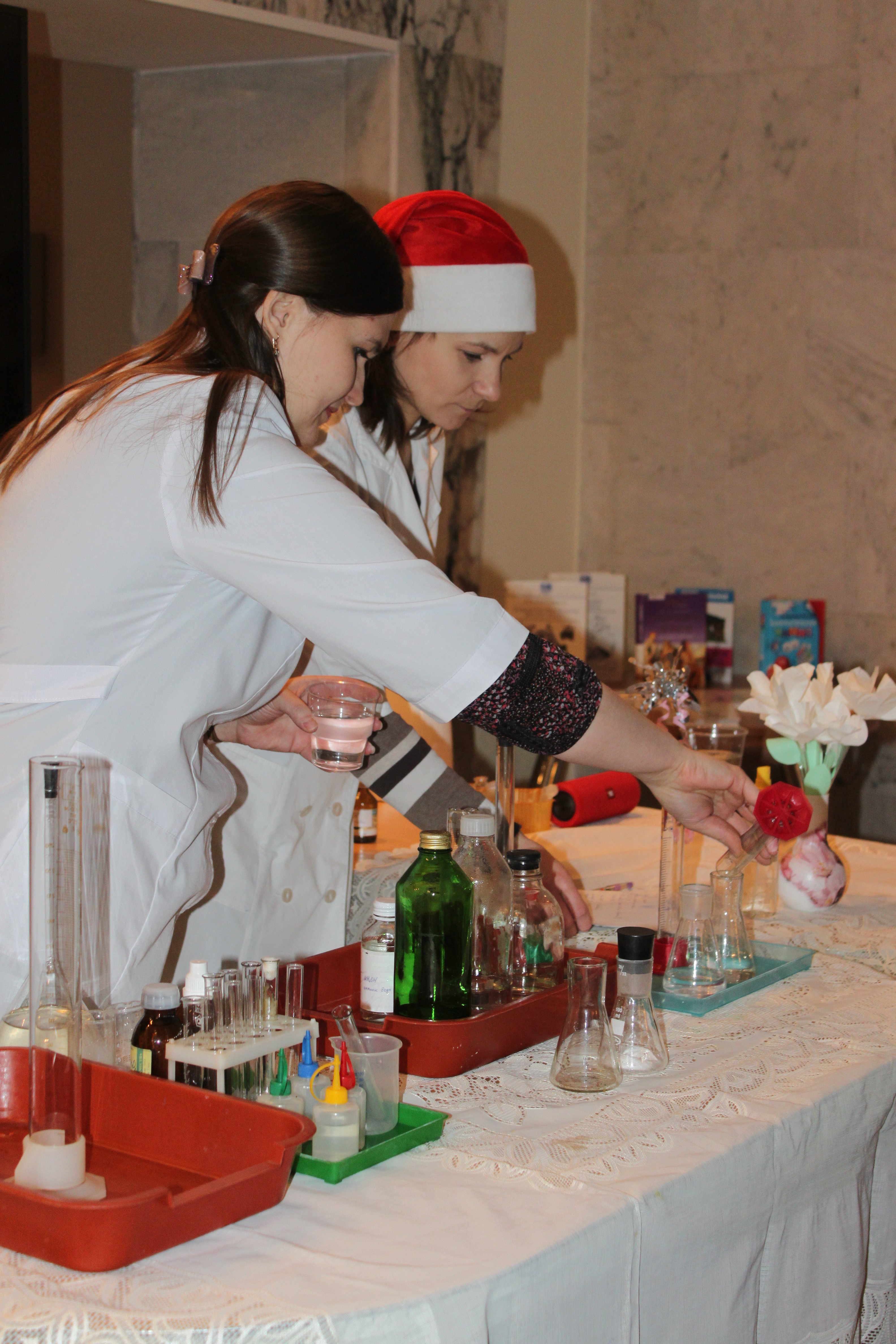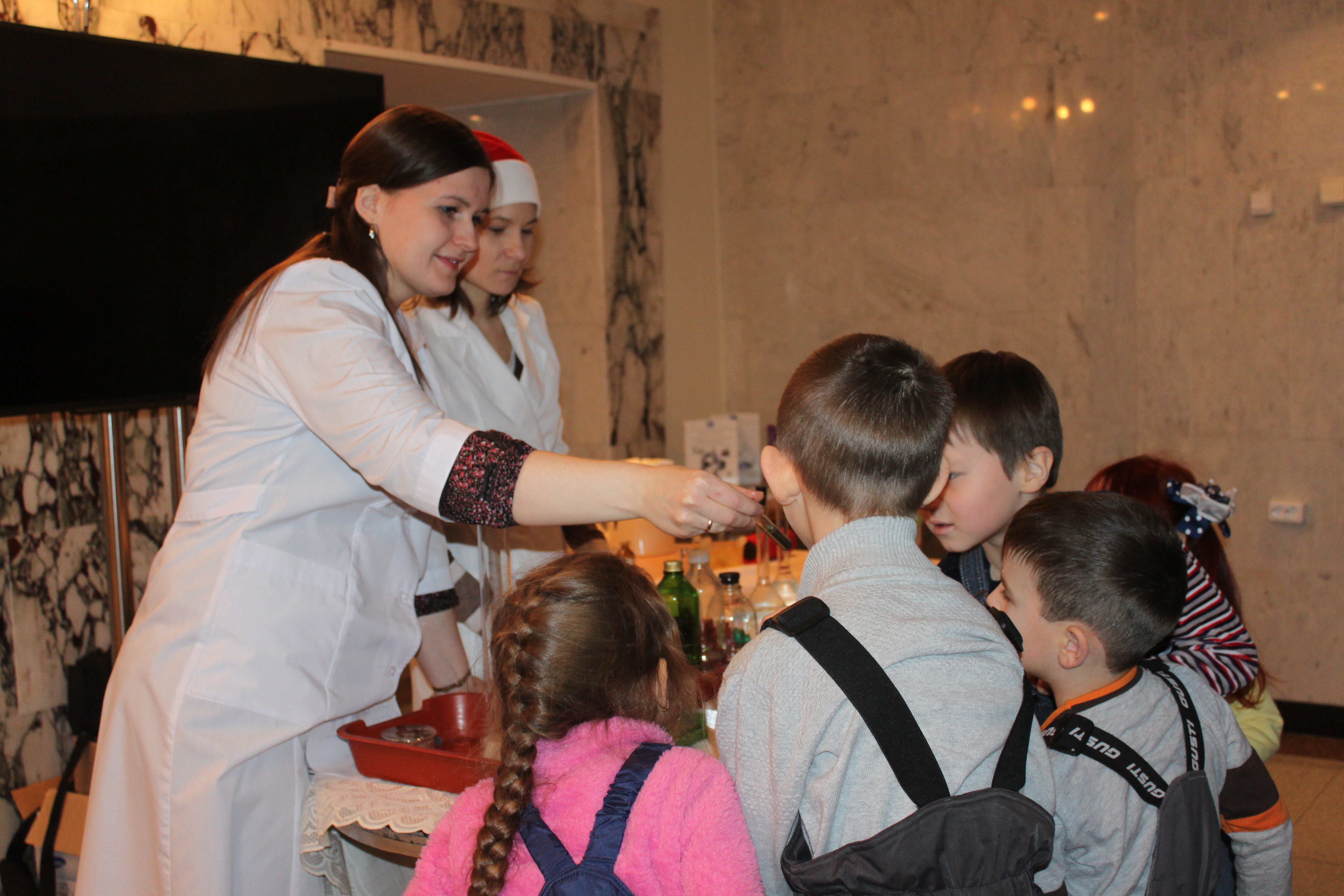 25 декабря в Центральной библиотеке им. А. С. Пушкина прошел волшебный новогодний праздник. Сотрудники кафедры химии Института естественных и технических наук Л. Н. Щербакова и В. В. Крайник ставили для детей и их родителей интересные химические опыты.