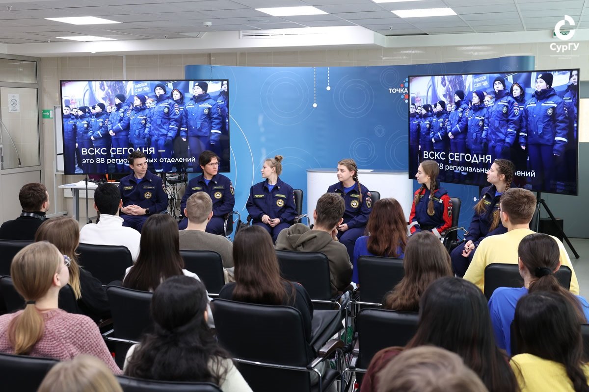 Добровольцы студенческого спасательного отряда «СЕВЕР» Ханты-Мансийского регионального отделения Всероссийского студенческого корпуса спасателей (ВСКС) встретились с представителями студенческого актива Сургутского госуниверситета в Точке кипения. Студенты рассказали о гуманитарной миссии «#МЫВМЕСТЕ с Донбассом», в которой принимали участие.