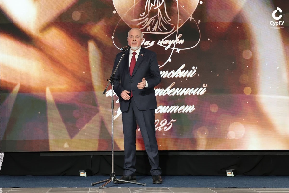 С торжественным обращением выступил депутат Государственной думы Российской Федерации Вадим Шувалов. Он назвал СурГУ флагманом в науке Югры, обозначив влияние разработок в различных областях, которые создаются здесь, и отметил, что своими достижениями университет обязан как людям, которые трудятся на его благо, так и руководству вуза.
