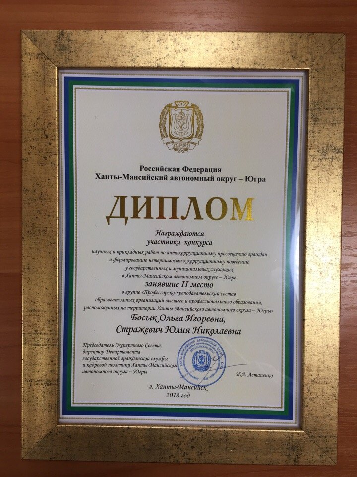 Кандидат юридических наук, доцент кафедры гражданско-правовых дисциплин и трудового права (ГПДиТП) Института государства и права Юлия Стражевич и преподаватель кафедры ГПДиТП Ольга Босык стали серебряными призерами конкурса научных и прикладных работ по антикоррупционному просвещению граждан и формированию нетерпимости к коррупционному поведению у государственных и муниципальных служащих в Ханты-Мансийском автономном округе. Совместный проект Юлия и Ольга посвятили совершенствованию антикоррупционного законодательства в отношении государственных гражданских служащих — участников хозяйственных обществ.