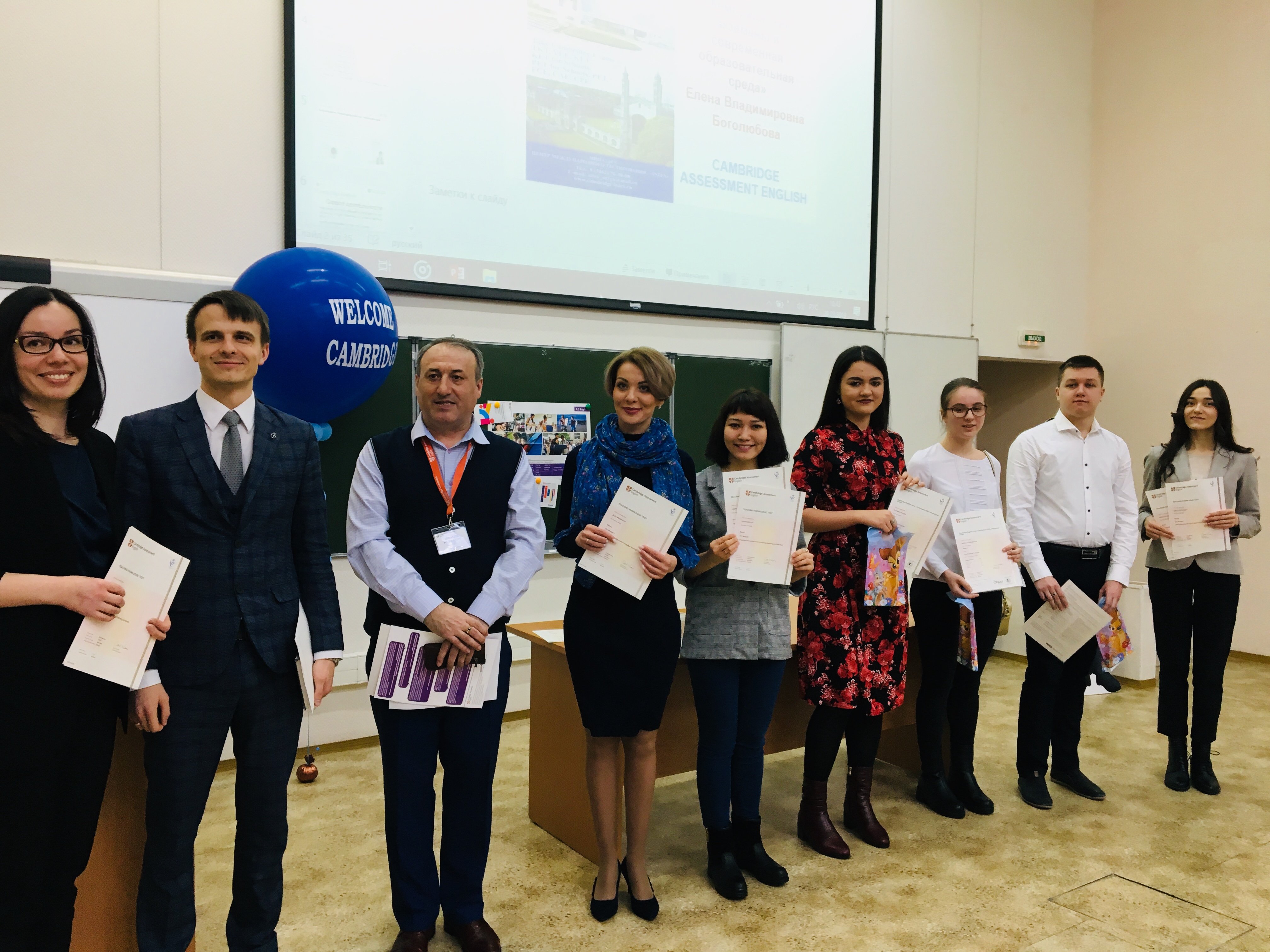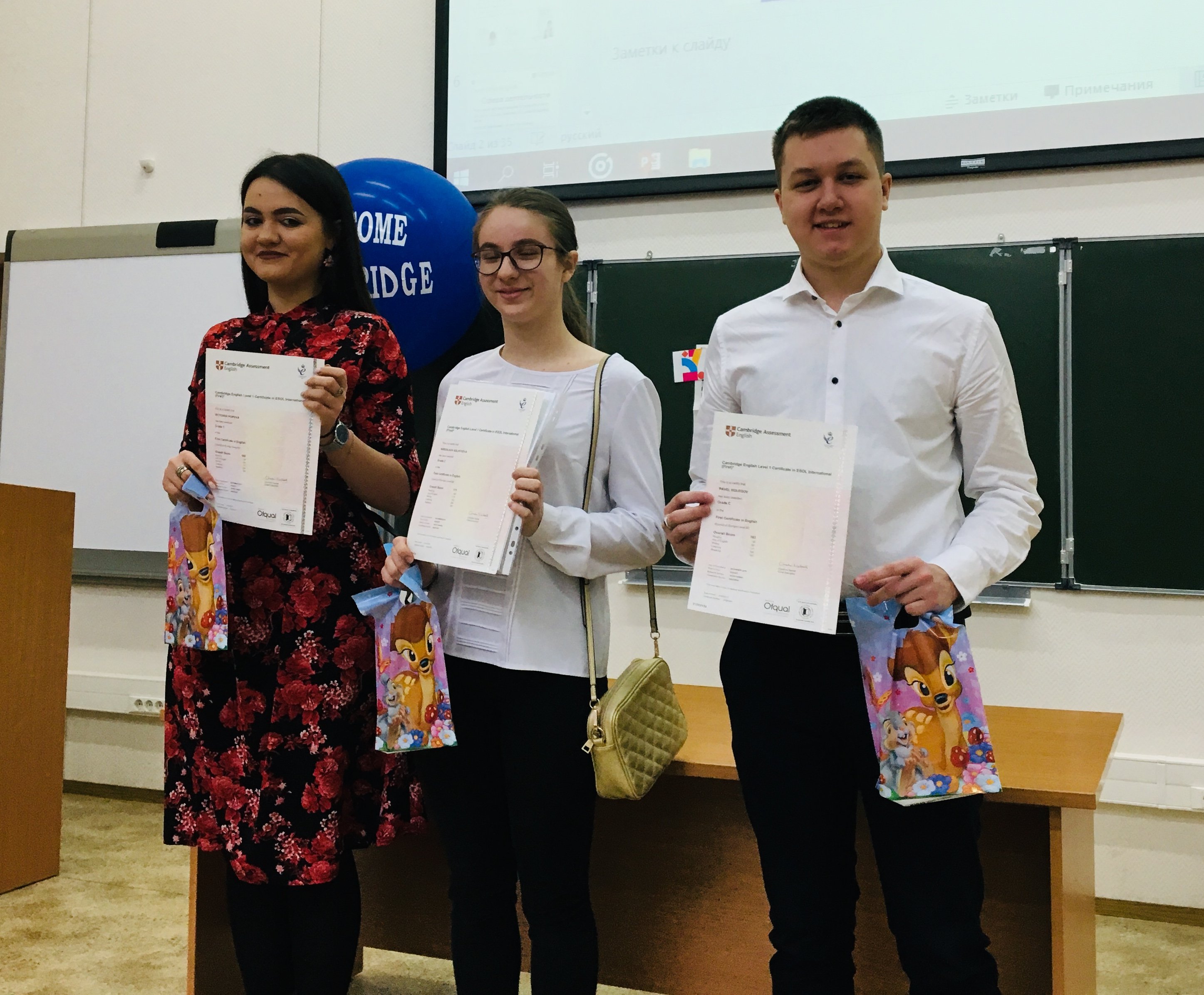В торжественной обстановке получили сертификаты учащиеся группы «Starters», сдавшие свой первый международный экзамен : Алексей и Анна Чмых, Алина Решетняк, Ирина Попенко, Мария Иванова, Анжелика и Алина Бдоян. Экзамен KET - Таисия Авдеева, Дарья Кирпиченкова, Сергей Тимонин, София Коробова; экзамен PET - Марат Курбанов ( победитель конкурса «Я учу английский-2017», обладатель 5-ти сертификатов Cambridge English) , Роман Мищенко - победитель конкурса «Я учу английский-2018», Анастасия Ковалева, Ева Полянцева, Ольга Козлова, Дарья Корунец (обладательница 4-х сертификатов Cambridge English); экзамен FCE - Павел Колегов, Ярослава Солнцева (3 сертификата Cambridge English), Инна Кобыльник, Виктория Попова, Юлдуз Гильмутдинова, Дарья Быкова, Гюнай Галандарова.