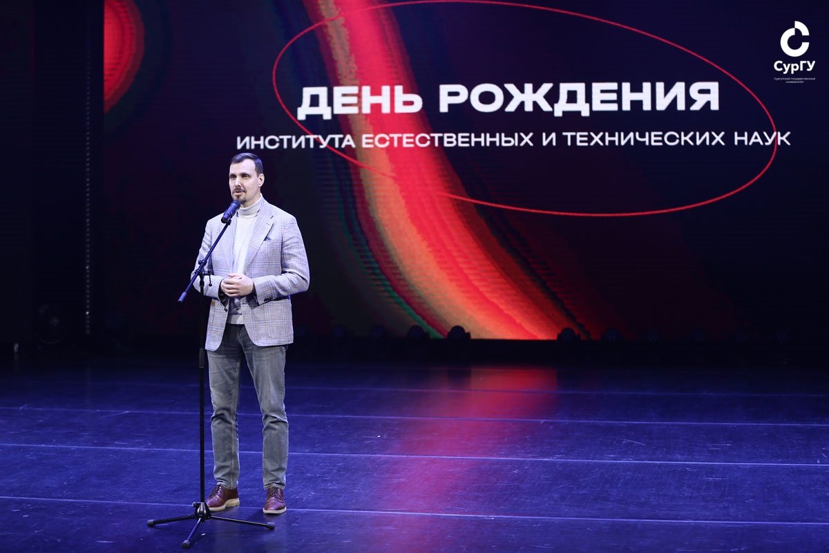 – Я сам химик, поэтому очень рад, что именно мне выпала миссия поздравить вас с этим праздником. Мы отслеживаем вклад каждого института в развитие научной деятельности, а он у Института естественных и технических наук один из самых весомых. Те стратегические ставки, которые есть у нашего университета, тесно связаны с вашей деятельностью. Речь о проекте «Цифра нефти», одном из крупных направлений создаваемого инновационного научно-технологического центра в Югре. Он связан с энергетической безопасностью, цифровой трансформацией, нефтегазодобывающей индустрией. Поэтому роль института сложно переоценить. От всей души поздравляю вас с днем рождения естественно-научного технического образования, – сказал со сцены проректор по науке и технологиям СурГУ Роман Оствальд.