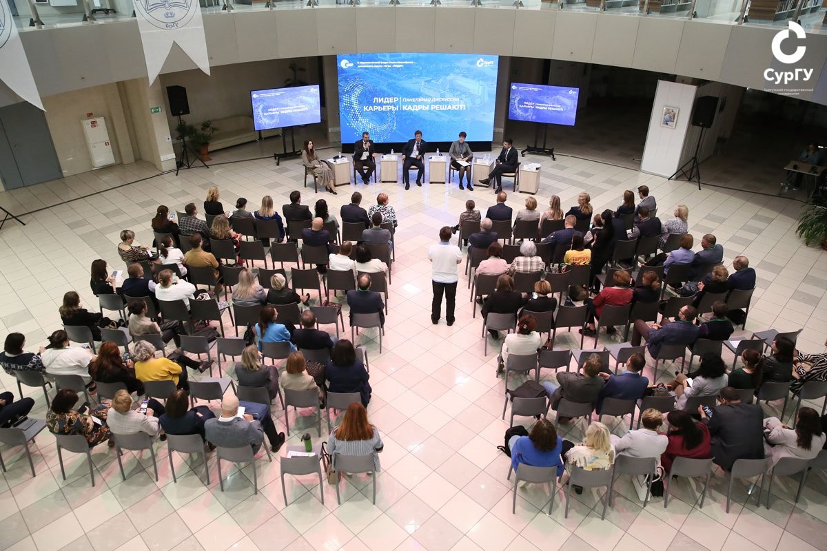 Спикеры открытого диалога: начальник инженерно-технического центра ООО «Газпром трансгаз Сургут» Алексей Ворникой; управляющий Югорским отделением ПАО «Сбербанк» Виталий Дорошенко; заместитель начальника департамента управления персоналом и организационного проектирования – начальник отдела развития персонала и социальных программ АО «Россети Тюмень» Ольга Харисова; проректор по учебно-методической работе СурГУ Елена Коновалова.