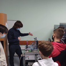 Запевалова Лариса Юрьевна рассказала ученикам об истории развития микропроцессорной техники. Запевалов Андрей Валентинович показал возможности роботов по распознаванию цветных объектов и продемонстрировал, как роботы могут выбирать траекторию движения в зависимости от окружающих препятствий. Назаров Евгений Владимирович рассказал о возможностях использования конвейерных линий и лабораторных установках пневмо- и гидроуправления.
