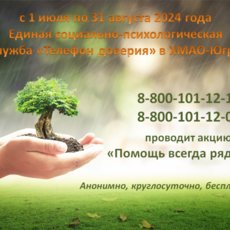 С 1 июля по 31 августа 2024 года в Ханты-Мансийском автономном округе – Югре Единая социально – психологическая служба «Телефон доверия» проводит акцию: «Телефон доверия - Помощь всегда рядом».
