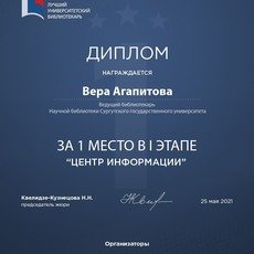 Ведущий библиотекарь Научной библиотеки СурГУ Вера Агапитова стала победителем I этапа Всероссийского конкурса «Лаборатория лидерства – 2021: лучший университетский библиотекарь».