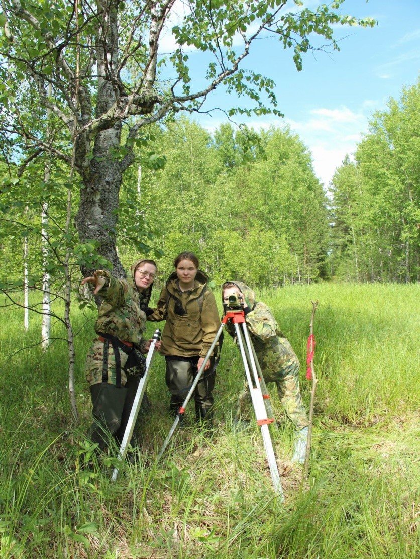 Лаборант Центра коллективного пользования Гаевская Виктория Викторовна совместно с научными сотрудниками и студентами ИГОиС (каф. истории России) осуществляет зондаж болот для определения подболотного рельефа, разбивку территории с использованием тахеометра и отбор образцов посредством геологического бурения.
