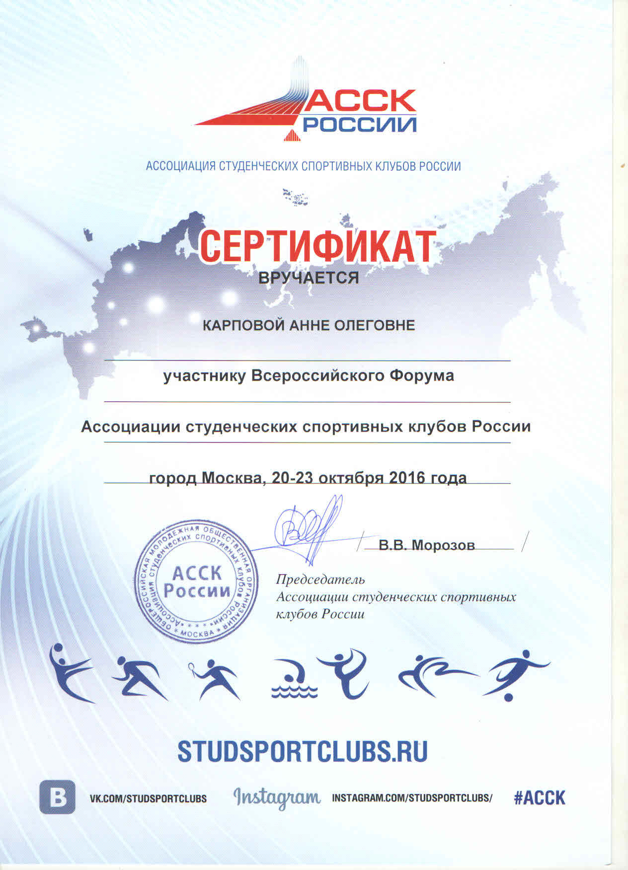 С 20–23 октября 2016 года в г. Москве состоялся Всероссийский форум АССК России. Студентка СурГУ группы 205-61м ИГОиС Карпова Анна представила родной университет на форуме. В программе мероприятий на первый день были заявлены: заседание координационного совета АССК России, дискуссионный клуб АССК России, встреча с представителем Министерства спорта Российской Федерации.