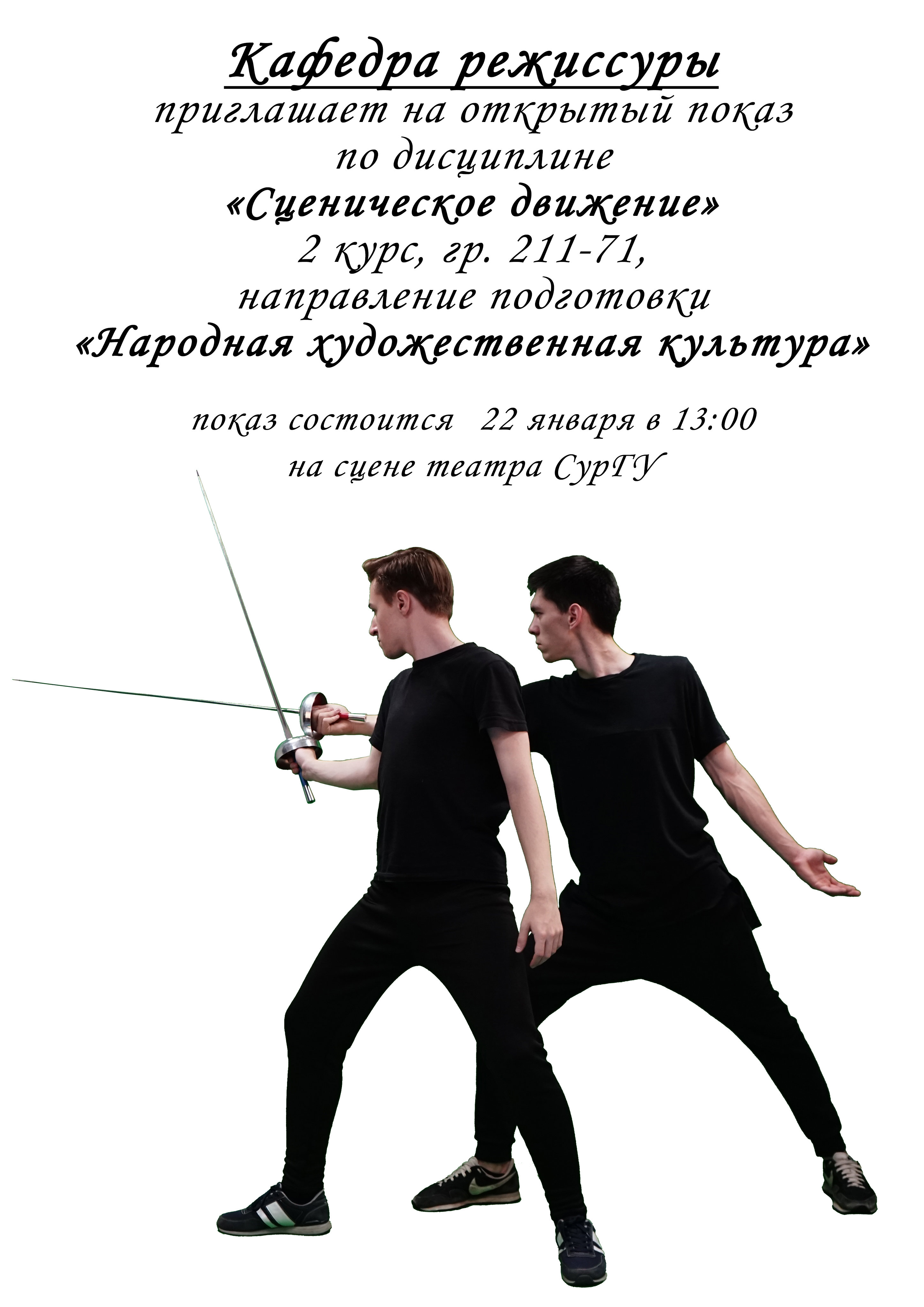 Кафедра режиссуры приглашает всех желающих на открытый показ по дисциплине «Сценическое движение», 2 курс группа 211-71. Показ состоится на главной сцене Театра СурГУ 22 января в 13:00. (С 12:30 будет открыт переход между корпусом и театром)