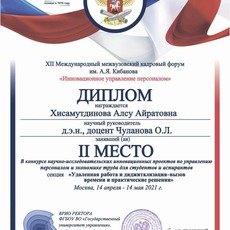 Дипломом «Лучший инновационный проект» награждена Асия Баймашева за научно-исследовательский проект «Применение HR-аналитики для оптимизации процессов работы с персоналом и кластеризации функционала HR-аналитика на основе K-MEANS». За инновационный проект «Модель интеграции концепции «экологичного офиса» как составляющей технологии WELL-BEING в работу с персоналом» дипломом первой степени в секции «Эффективное использование и инновационные технологии управления персоналом» награждена Анна Рябова.