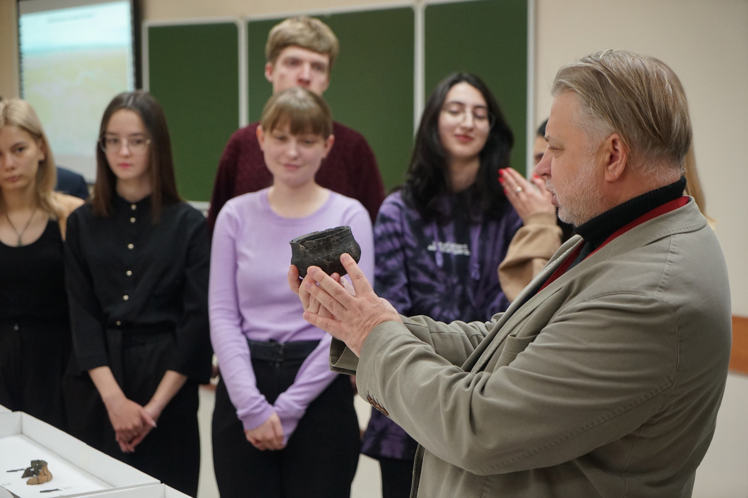 Руководитель Центра югорской археологии и этнографии СурГУ Олег Кардаш и ведущий научный сотрудник Института гуманитарного образования и спорта СурГУ Георгий Визгалов поведали собравшимся студентам о памятниках археологии Югры и научных проектах с ними связанных. А студенты историки и музеологи, побывавшие на археологической практике, рассказали о работе на раскопках и участии в мероприятиях. Специально к конференции были подготовлены выставки артефактов из раскопок 2023 года и реплик неолитических орудий труда, созданных во время летних научных экспериментов.