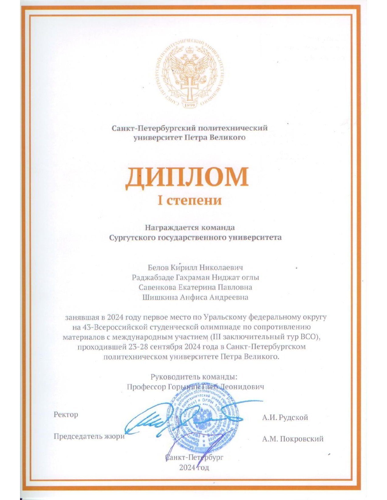 Команда СурГУ заняла первое место по Уральскому федеральному округу на 43-й Всероссийской студенческой олимпиаде по сопротивлению материалов с международным участием (III заключительный тур ВСО).