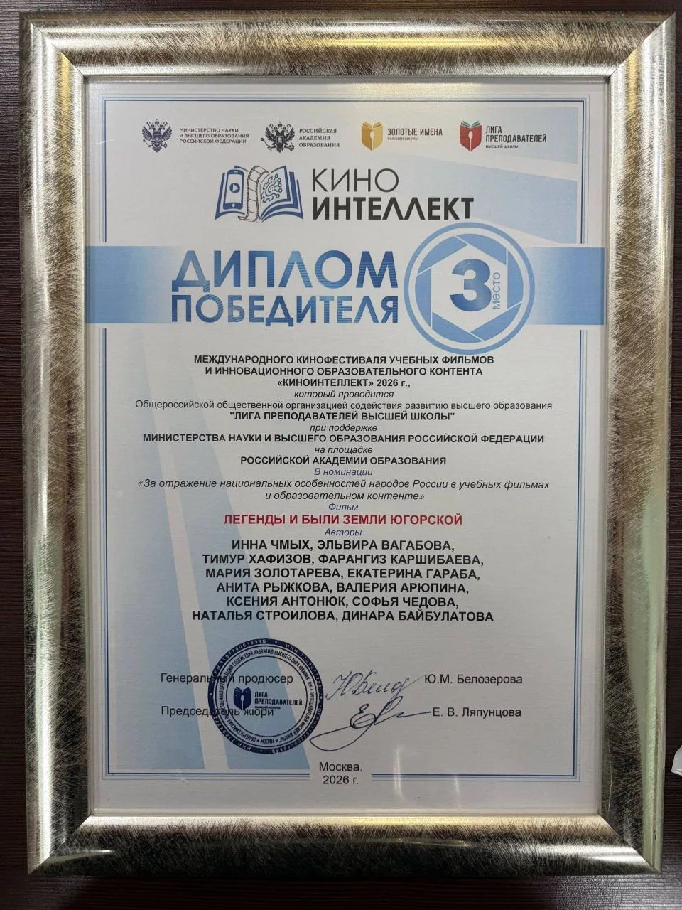 Вот уже третий год подряд лингвисты Сургутского государственного университета одерживают блестящую победу в международном кинофестивале учебных фильмов и инновационного образовательного контента «КиноИнтеллект – 2026». Фестиваль организует Лига преподавателей высшей школы при поддержке Министерства науки и высшего образования Российской Федерации. Торжественная церемония награждения победителей и призеров прошла 14 апреля в Москве на площадке Российской академии образования. Всего конкурс собрал более 500 участников из 32 стран.