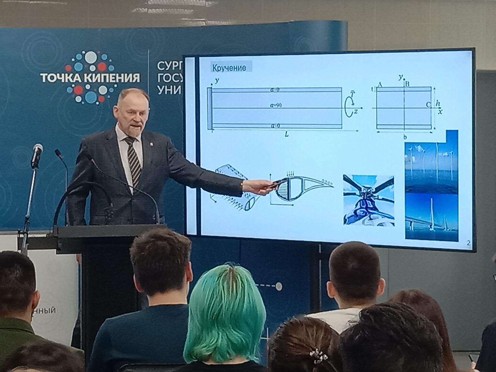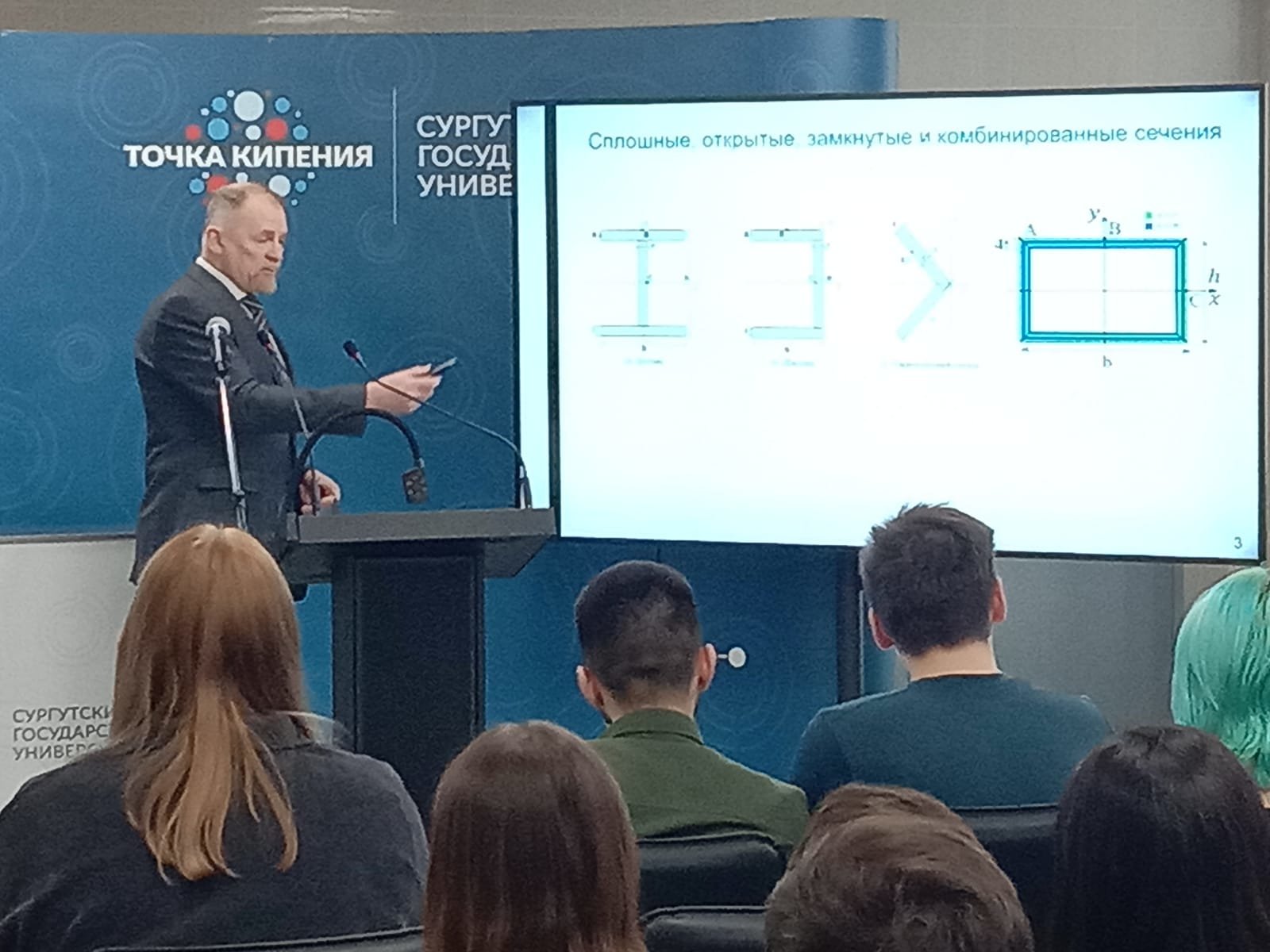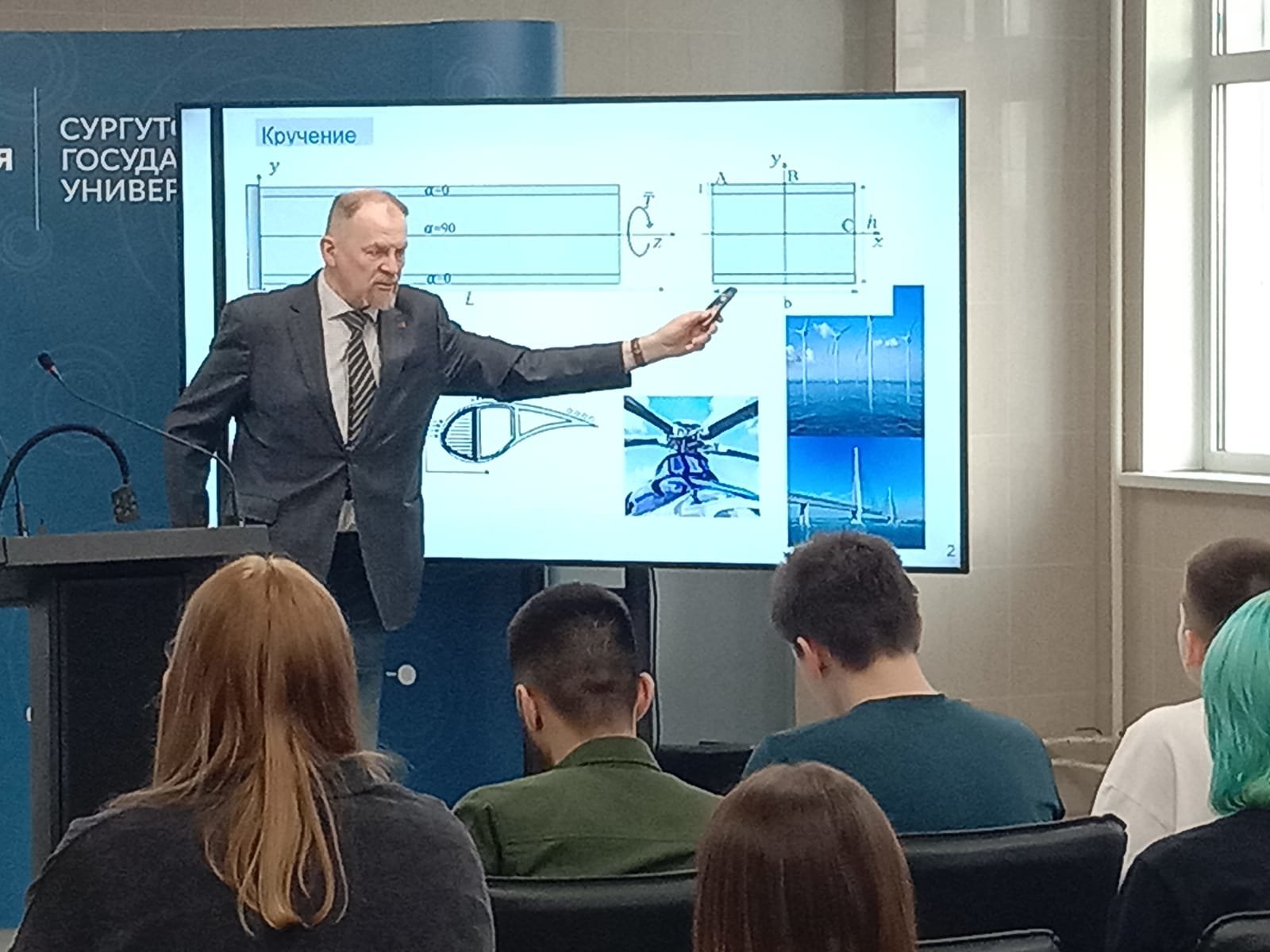 В Сургутском государственном университете 30.05.2024 г. в 18:00 в рамках научно-популярного лектория прошла очередная открытая лекция по интересной теме для студентов Политехнического института и физико-математического сообщества: «Стесненное кручение стержней, проблемы и достижения».