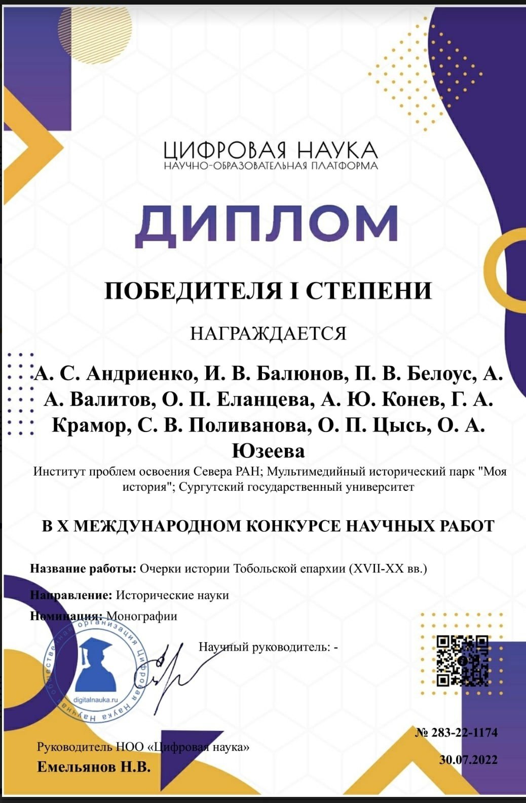 Коллективная монография «Очерки истории Тобольской епархии (XVII–XX вв.)», подготовленная учеными Сургутского госуниверситета, Института проблем освоения Севера и Мультимедийного исторического парка «Моя история», получила признание на X Международном конкурсе научных работ, организованным НОО «Цифровая наука».