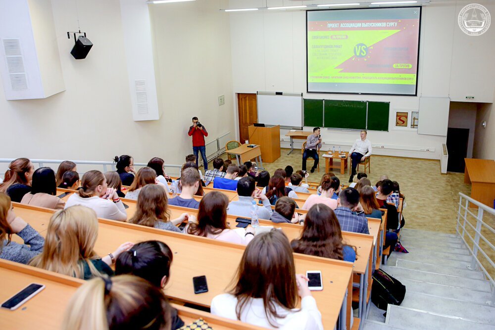 20 февраля в университете впервые прошел батл, в котором сошлись одни из лучших выпускников СурГУ — Ринат Салахутдинов и Сергей Антонов. Будучи кандидатами экономических наук, каждый нашел для себя занятие по душе — один ушел с головой в бизнес, открыв в городе кроссфит-зал и сеть аптек, другой — построил успешную карьеру в Центре культуры и досуга «Камертон» (ООО «Газпром трансгаз Сургут»), став руководителем учетно-контрольной группы. Но что же все-таки лучше — заниматься бизнесом или пойти по протоптанной дорожке, выбрав работу по найму? На этот вопрос и предстояло ответить двум опытным и талантливым выпускникам.