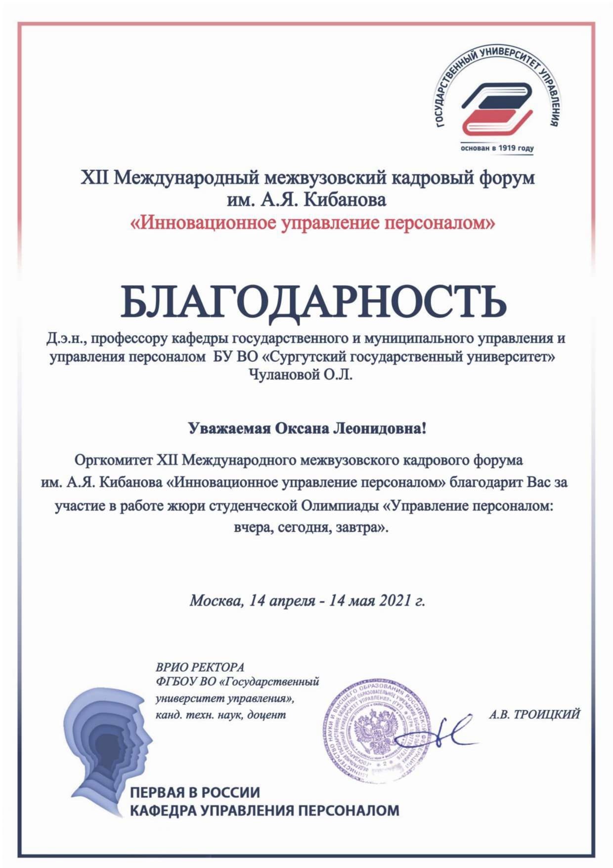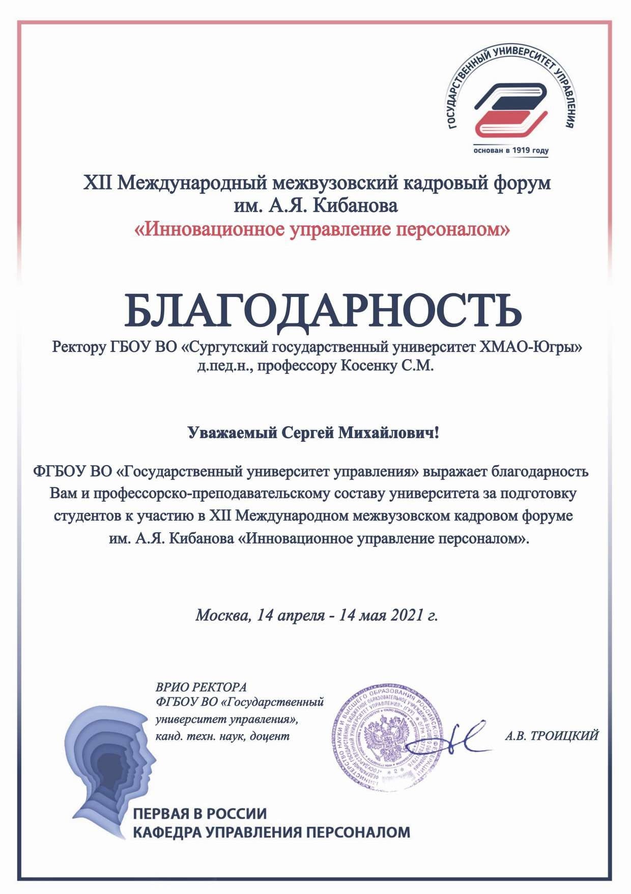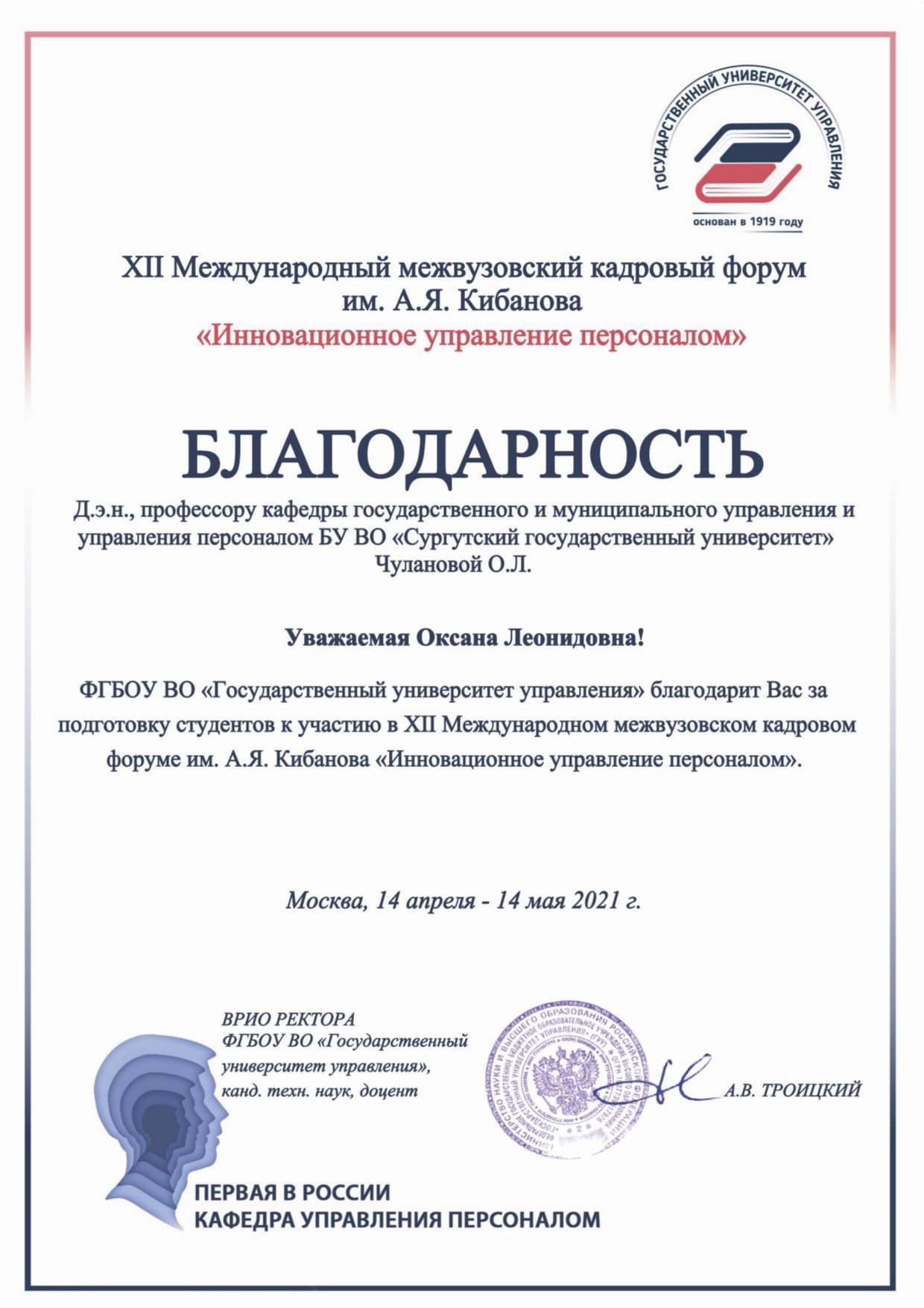 В Государственном университете управления (г. Москва) подвели итоги XII Международного межвузовского кадрового форума им. А. Я. Кибанова «Инновационное управление персоналом». Более 500 студентов и преподавателей вузов, представителей организаций реального сектора экономики не только России, но и других стран приняли участие в его онлайн-работе. По традиции не упустил возможность показать уровень подготовки студентов, их конкурентоспособность на рынке труда и Сургутский госуниверситет.