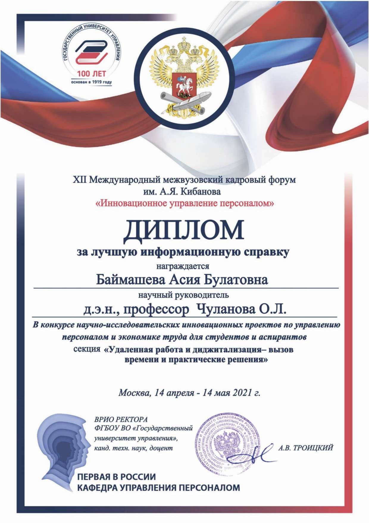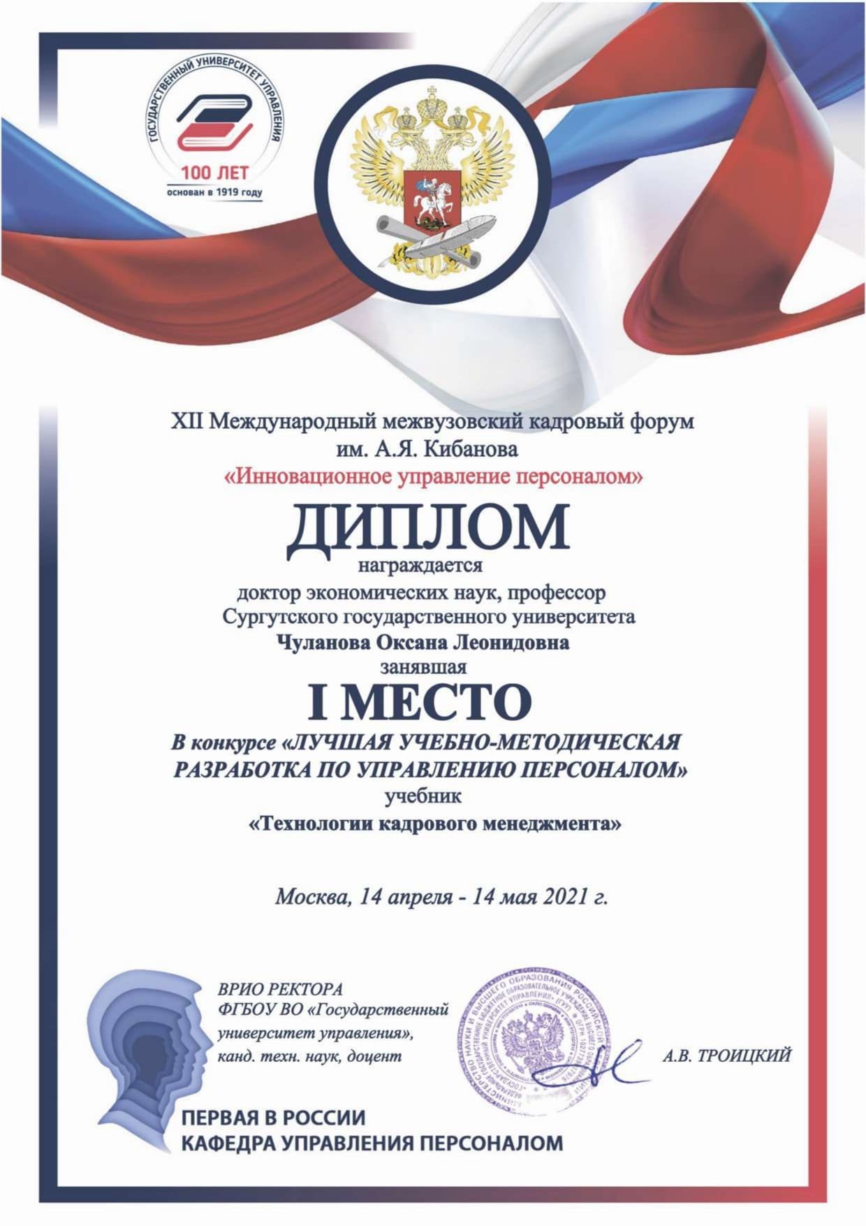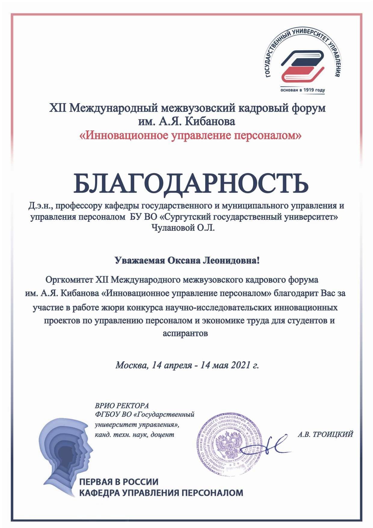 В Государственном университете управления (г. Москва) подвели итоги XII Международного межвузовского кадрового форума им. А. Я. Кибанова «Инновационное управление персоналом». Более 500 студентов и преподавателей вузов, представителей организаций реального сектора экономики не только России, но и других стран приняли участие в его онлайн-работе. По традиции не упустил возможность показать уровень подготовки студентов, их конкурентоспособность на рынке труда и Сургутский госуниверситет.