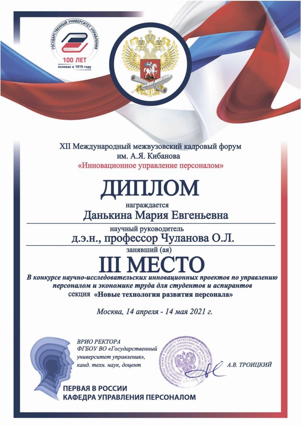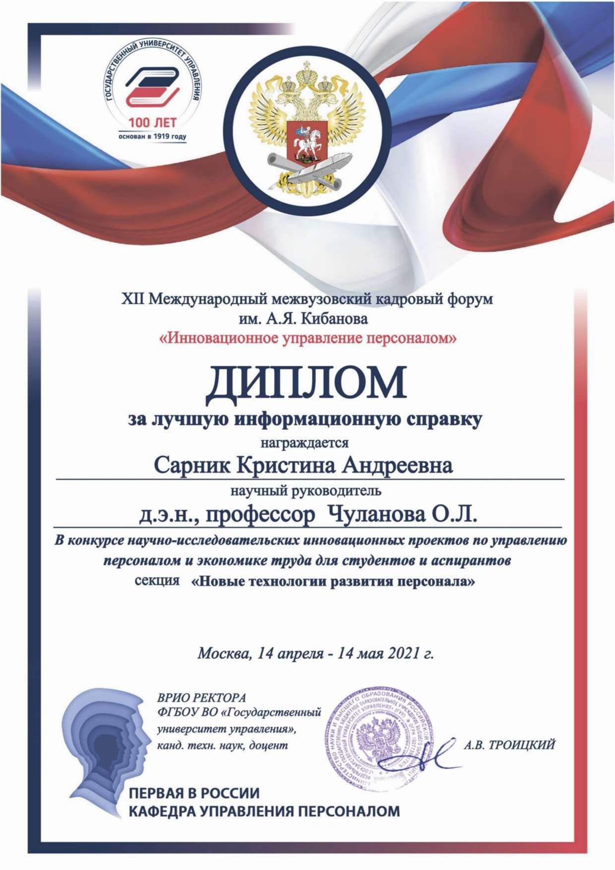 В секции «Новые технологии развития персонала» третье место у Марии Данькиной за исследование «GAME&TRAINING» и интеграция его в обучение персонала организации». Кристина Сарник награждена дипломом «Лучшая информационная справка» за проект «Разработка инструментария обучения персонала организации с применением технологий VR в условиях удаленной работы».