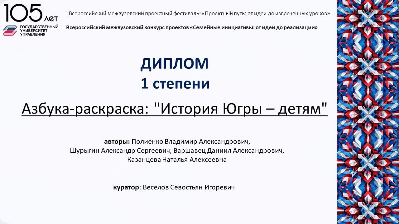 Третьекурсники направления «история» Института гуманитарного образования и спорта Сургутского госуниверситета заняли первое место на Всероссийском межвузовском конкурсе проектов «Семейные инициативы: от идеи до реализации» за социальный проект азбуки-раскраски «История Югры – детям», направленный на освоение и запоминание учащимися начальных классов истории автономного округа в познавательно-развлекательной форме.