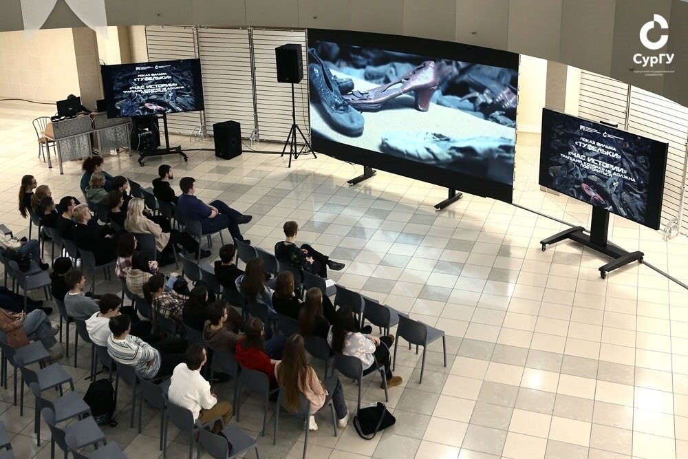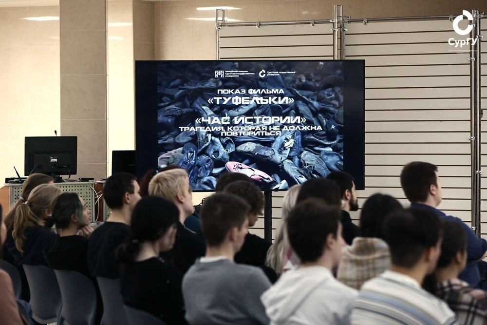 В атриуме 29 января прошли просмотр и обсуждение короткометражного фильма «Туфельки» (2012). Через призму вещей, безо всяких диалогов, не показывая лиц актеров, лента рассказывает историю жизни обычной еврейской девушки – одной из многих, погибших в немецких лагерях смерти. Сразу же после просмотра фильма состоялся диалог о важном «Час истории. Трагедия, которая не должна повториться». В качестве эксперта выступил доцент кафедры политологии СурГУ Василий Мархинин. Его доклад был посвящен блокаде Ленинграда. Знать об этом важно и нужно, считает эксперт. Василий Васильевич проанализировал подготовку и проведение Ленинградско-Новгородской операции 14 января – 1 марта 1944 года, а также быт жителей блокадного Ленинграда. В частности, были представлены фотографии книг научного, прикладного и досугового характера, издававшиеся в городе в то время.