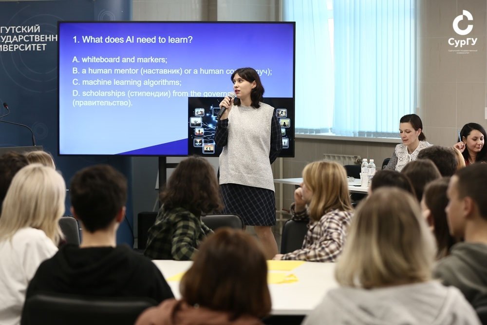 «Искусственный интеллект меняет мир вокруг нас» – такова была тема дискуссии, участвовать в которых могли все желающие студенты СурГУ. Традиционно мероприятие проходило на русском и английском языках. На обсуждение выносились вопросы не только о практике и истории, но и об этической стороне применения искусственного интеллекта. Участников разделили на команды, которым предлагалось ответить на ряд вопросов в формате тематических викторин на английском языке, решить несколько этически-философских дилемм, а также определить, какие из утверждений об ИИ являются фактом, а какие – выдумкой. Команды успешно и с энтузиазмом выполнили все задания!