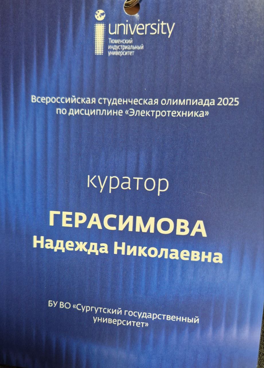 Команда студентов третьего курса направления «электроэнергетика и электротехника» СурГУ вместе с ассистентом кафедры радиоэлектроники и электроэнергетики Надеждой Герасимовой участвует в заключительном этапе Всероссийской студенческой олимпиады образовательных организаций высшего образования по дисциплине «Электротехника». Соревнование проходит в Тюменском индустриальном университете с 20 по 21 ноября.