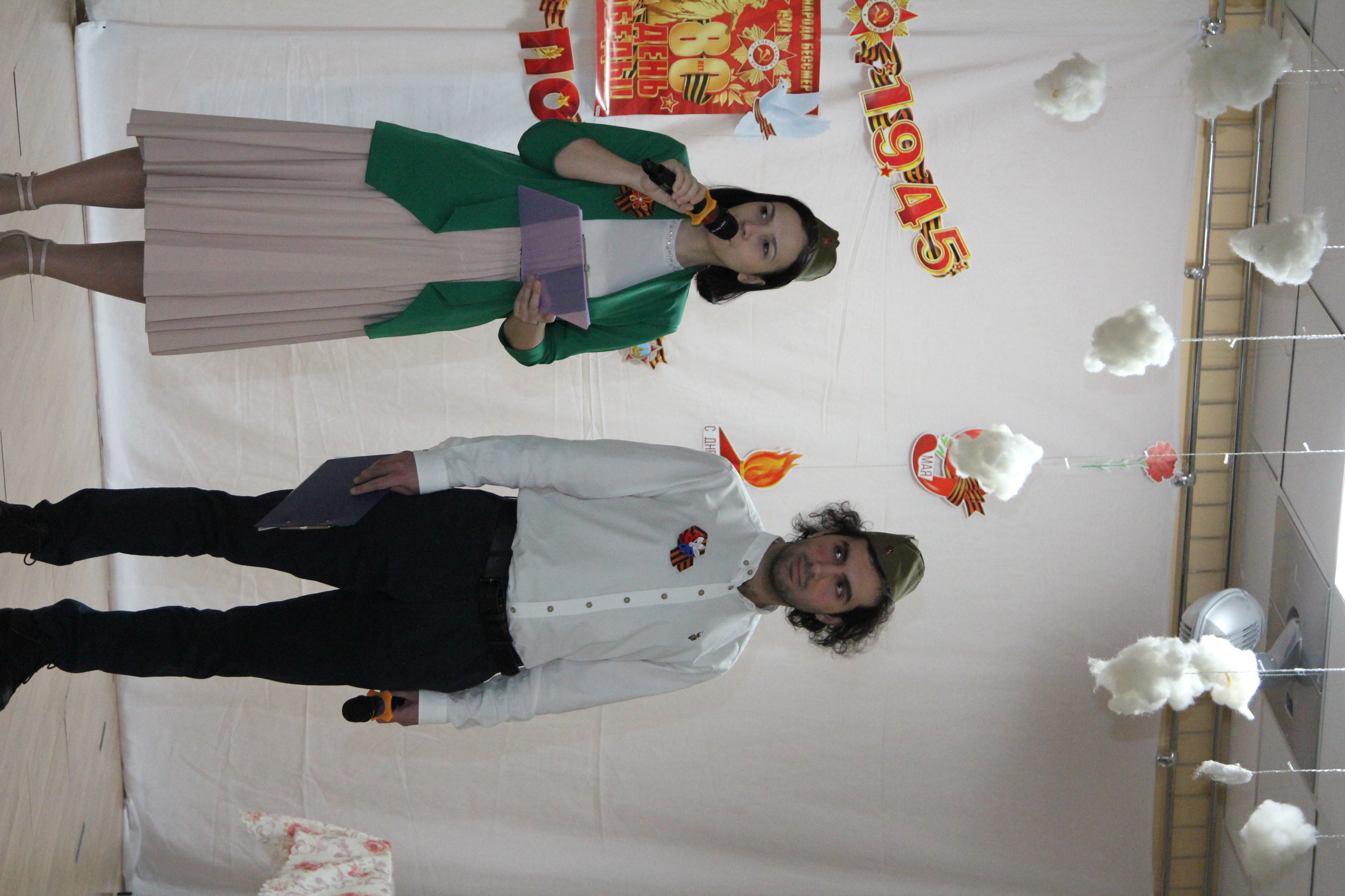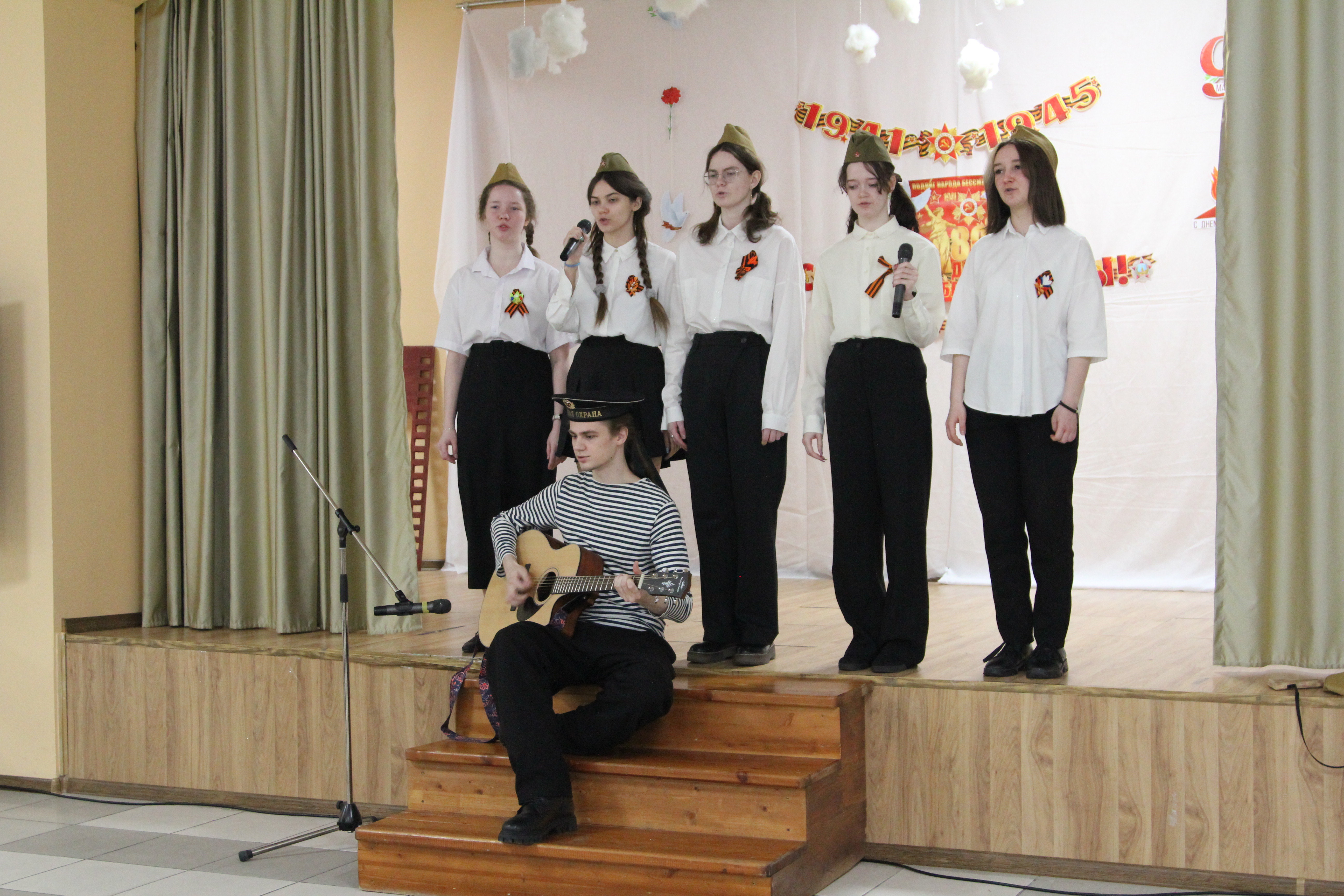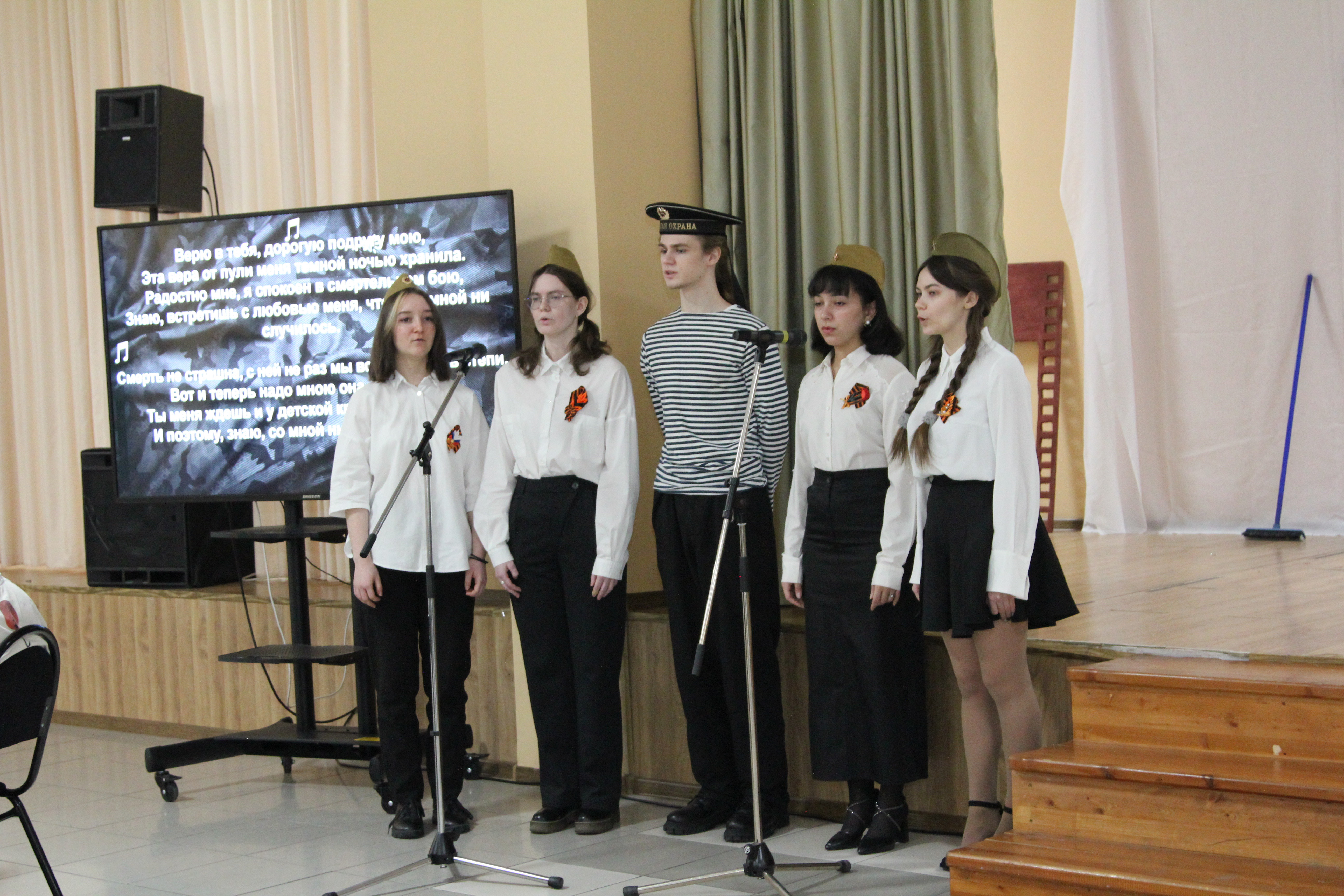 В перерывах между ответами на вопросы разной сложности были музыкальные паузы на военную тему, подготовленные студентами второго курса направления «лингвистика». Студенты: Карина Ревенок, Максим Дмитренко, Вероника Гизатова, Екатерина Добросельская, Камилат Чистякова, Мария Попова, Софья Гончарук – исполнили песни военных лет «В землянке» (музыка Константина Листова, стихи Алексея Суркова) и «Темная ночь» (музыка Никиты Богословского, стихи Владимира Агатова). Трогательное исполнение и инсценировка песни «Темная ночь» студентами: Денисом Кривелевым, Гюнель Бадаловой, Викторией Рыбалко, Камилат Чистяковой – не оставили равнодушными никого в зале – пели все.