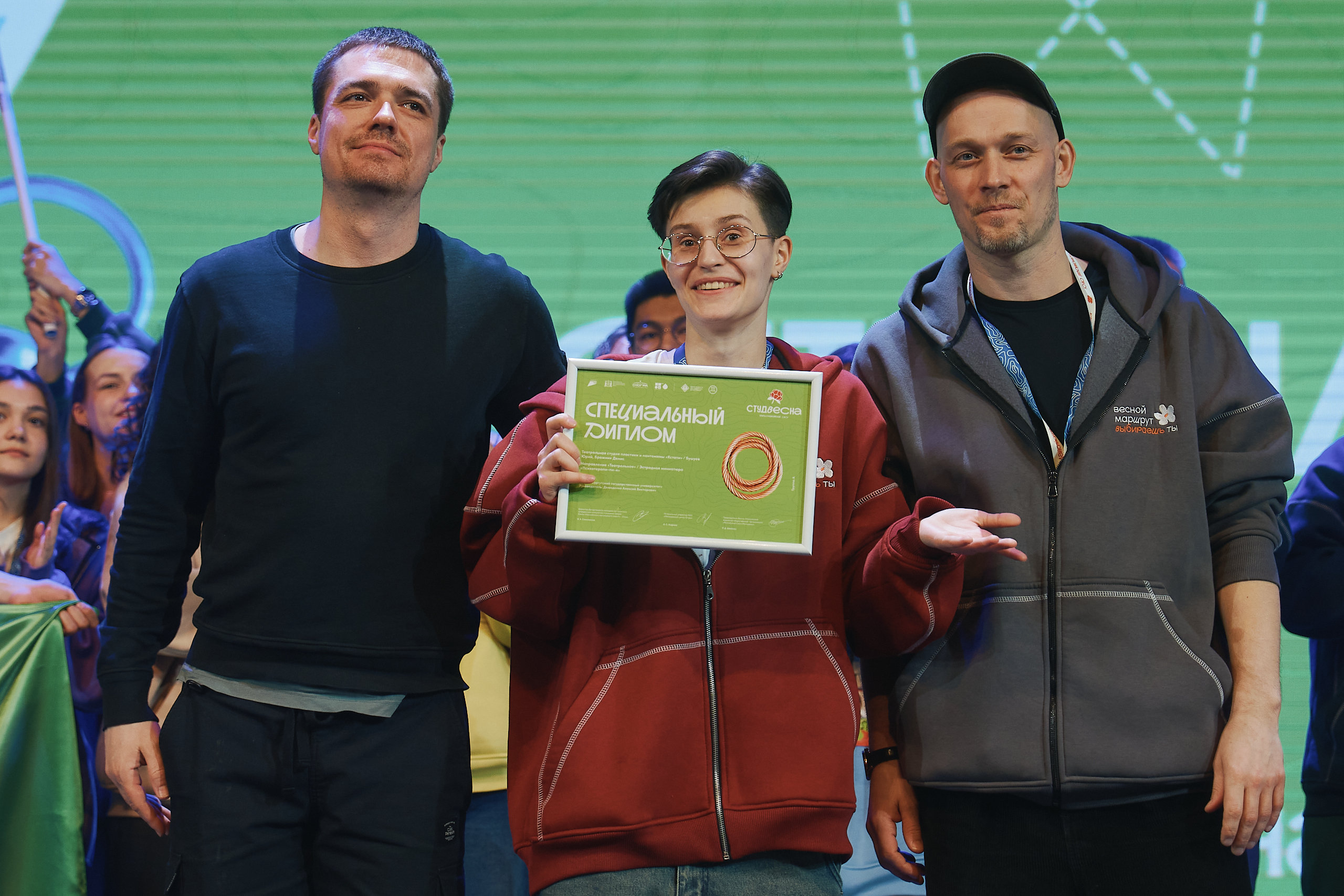 Крупнейший вуз Югры привез домой три награды, завоеванные в этом направлении. Серебряным призером в номинации «Фронтовая поэзия и проза» стала Влада Тимофеева, выступившая с номером «Девочки с Васильевского острова». Помимо этого, копилку наград СурГУ пополнил специальный приз в номинации «Эстрадная миниатюра». Его завоевала театральная студия пластики и пантомимы «Кстати» за постановку «Психотерапи-пи-я», в которой участвовали Денис Бражник и Юрий Бушуев.