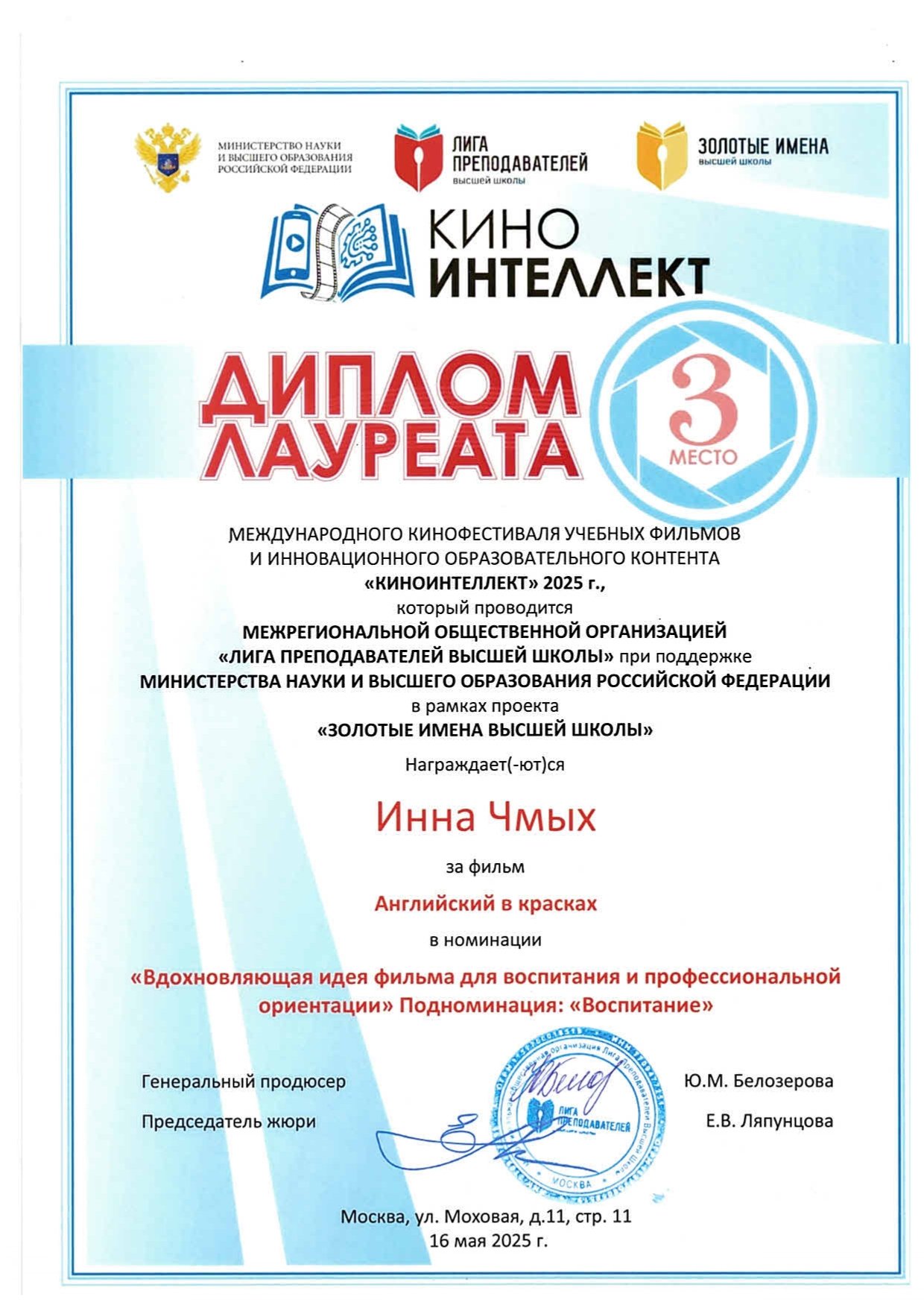 В Белом зале Государственного геологического музея им. В. И. Вернадского Российской академии наук 16 мая 2025 года на Торжественной церемонии награждения победителей Международного кинофестиваля учебных фильмов и инновационного образовательного контента «КиноИнтеллект – 2025», который проводится Межрегиональной общественной организацией «Лига преподавателей высшей школы» в рамках проекта «Золотые имена высшей школы» при поддержке Министерства науки и высшего образования РФ в рамках проекта «Золотые имена высшей школы», видеосюжет «Английский в красках» (“English in Living Colours”) студентов группы 208-22а направления «лингвистика» СурГУ под руководством к. п. н. доцента Чмых И. Е. получил диплом лауреата III степени и признан одним из лучших в номинации «Вдохновляющая идея фильма для воспитания и профессиональной ориентации» в подноминации «Воспитание», направленной на формирование нравственных и культурных ценностей у молодежи.