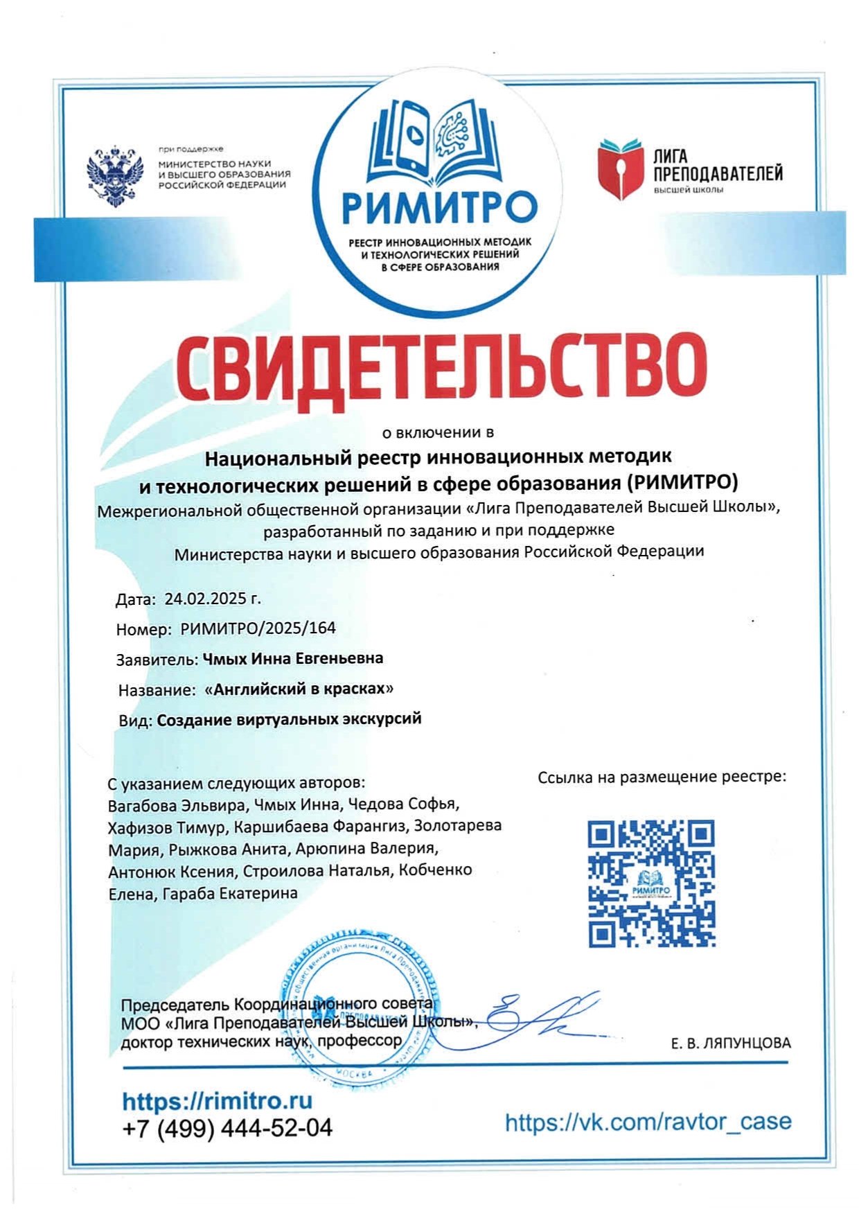 Проект «Английский в красках» также получил свидетельство о включении в Национальный реестр инновационных метод и технологических решений в сфере образования (РИМИТРО) Межрегиональной общественной организации «Лига преподавателей высшей школы», разработанной по заданию и поддержке Министерства науки и высшего образования Российской Федерации (Рег. номер РИМИТРО/2025/164 от 24.02.2025 г., вид – создание виртуальных экскурсий).